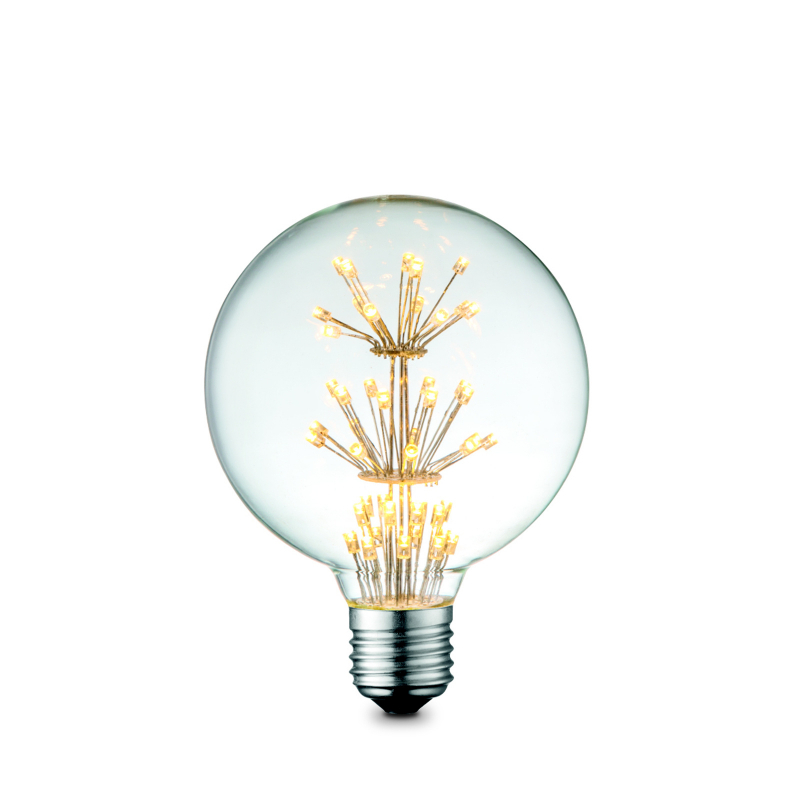 1,5W LED žiarovka je vyrobená z kovu a priehľadného skla svieti intenzitou 100 lúmenov s teplotou svetla 2300 kelvinov. Priemer žiarovky je 9,5 cm.